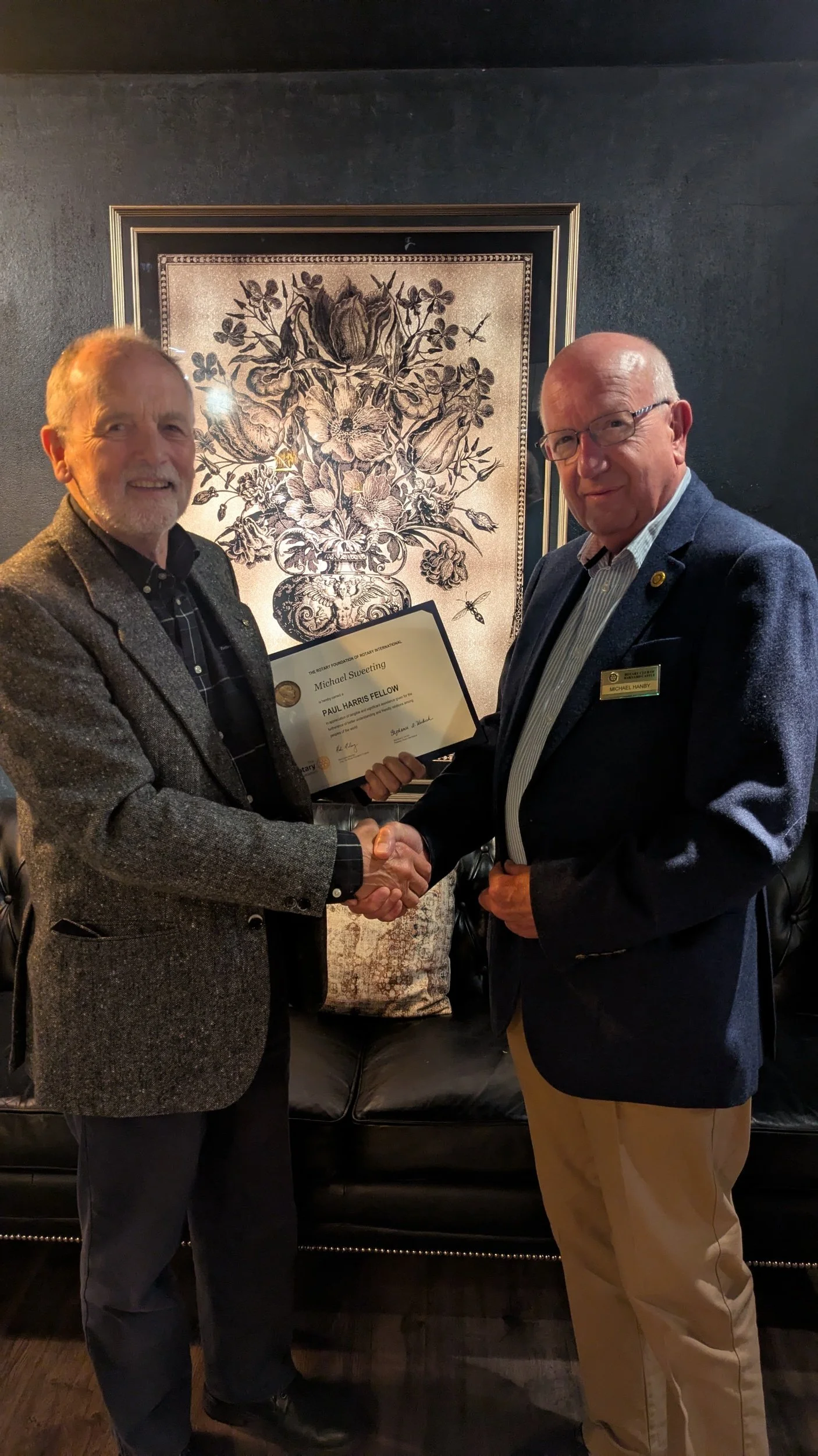 Furthermore, we had the honor this evening of awarding our fellow Rotation and dear friend, Mike Sweeting, with a Paul Harris Fellowship award for his significant contribution to Rotary and his local community. Congratulations Mike, well deserved!